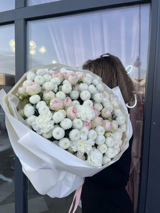Закажите букет из нежно-розовой кустовой розы, белой хризантемы и белых диантусов прямо сейчас и порадуйте своих близких и друзей стильным и оригинальным подарком!