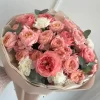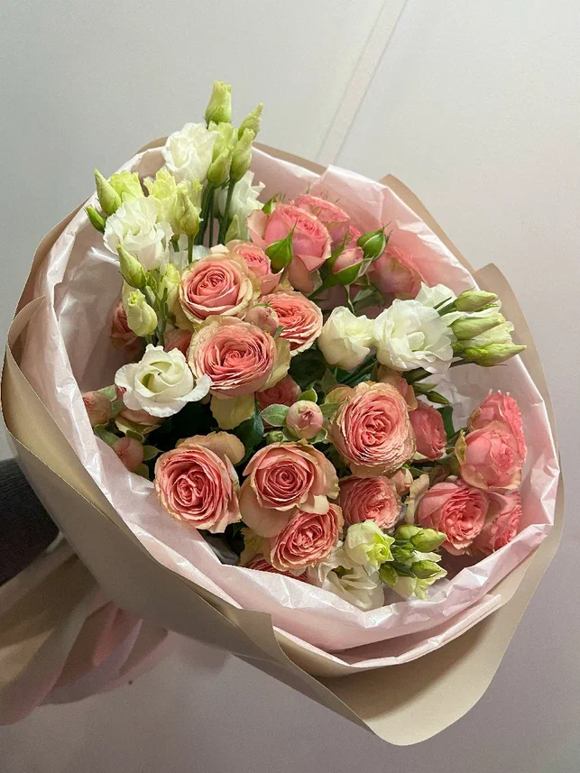 В нём сочетаются два самых нежных цветка: розовая кустовая роза и белая эустома. Этот букет станет прекрасным подарком на любой праздник или просто приятным сюрпризом для близких людей.