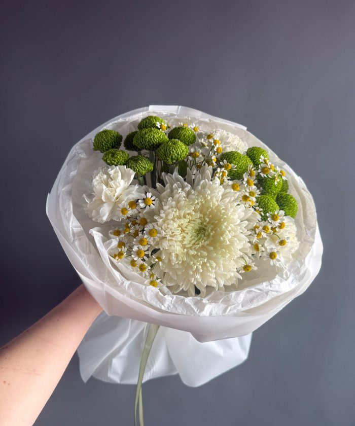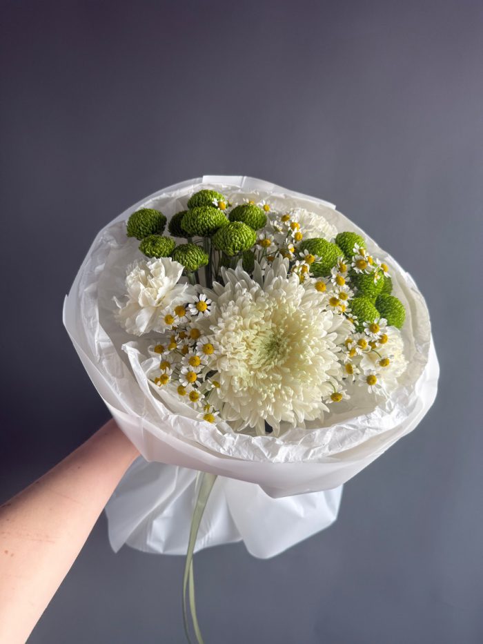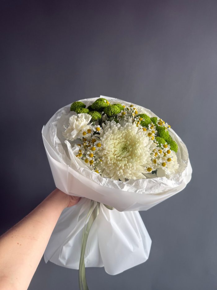 Состав: Одноголовая хризантема, танацетум, белые диантусы, хризантема Дели Грин, упаковка, лента