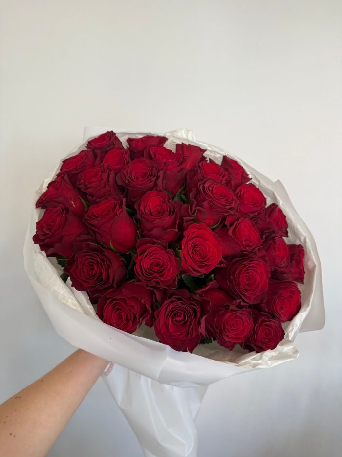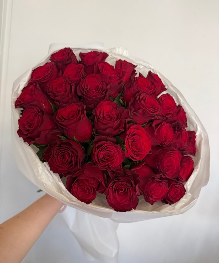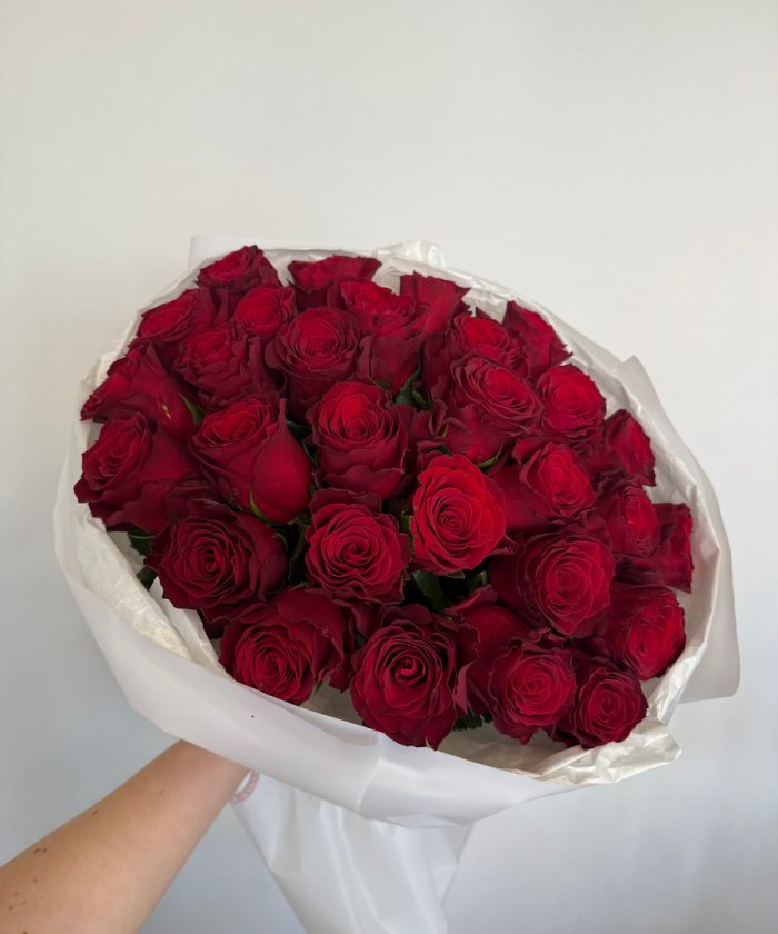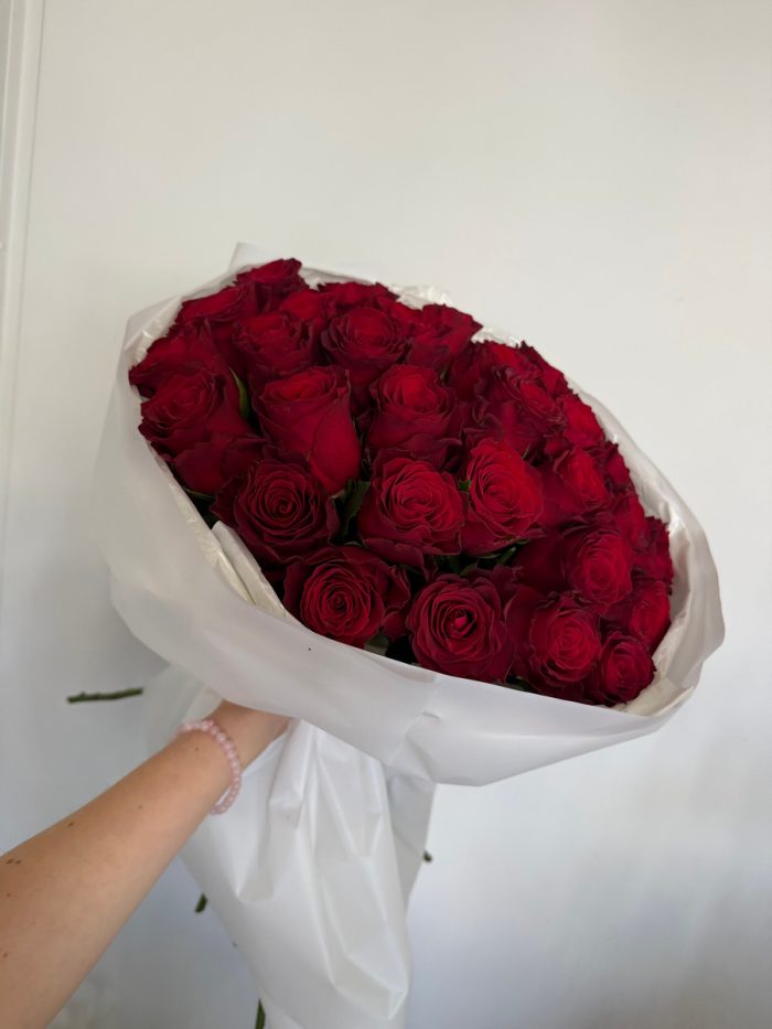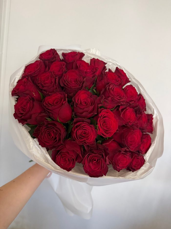 Состав: 29 красных роз Родос, упаковка, лента