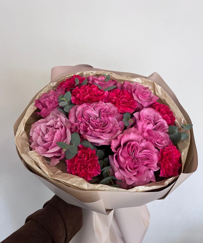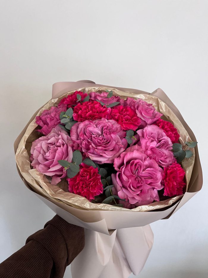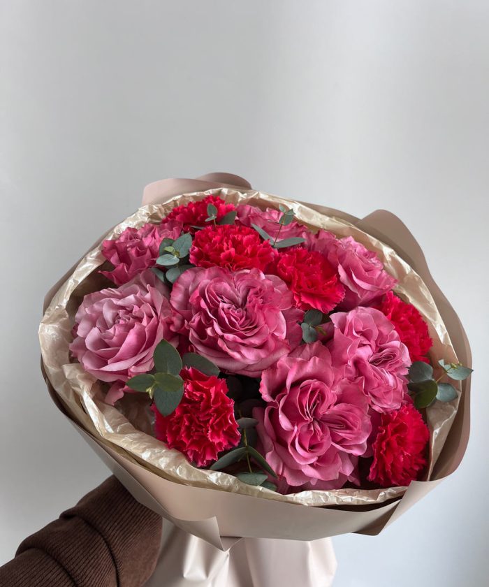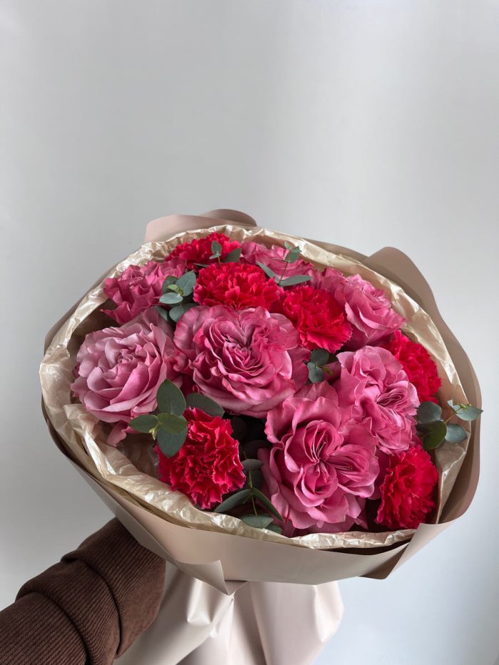 состав: пионовидная одноголовая роза, малиновые диантусы ,эвкалипт, упаковка