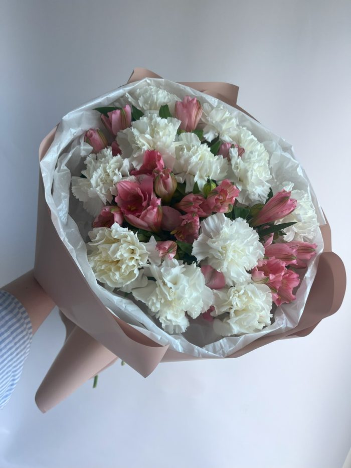 Белые гвоздики символизируют чистоту и искренность, в то время как розовые альстромерии добавляют нотку нежности и элегантности. Это сочетание делает букет универсальным подарком для любого случая — от дня рождения до годовщины или просто чтобы выразить свои чувства.